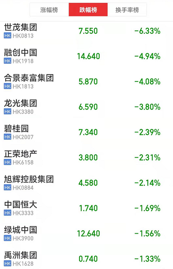 12月13日,港股内房股走低。截至发稿前,世茂集团领跌6.33%,融创中国、合景泰富集团跌超4%,龙光集团跌超3%,正荣地产、旭辉控股、中国恒大等跟跌。